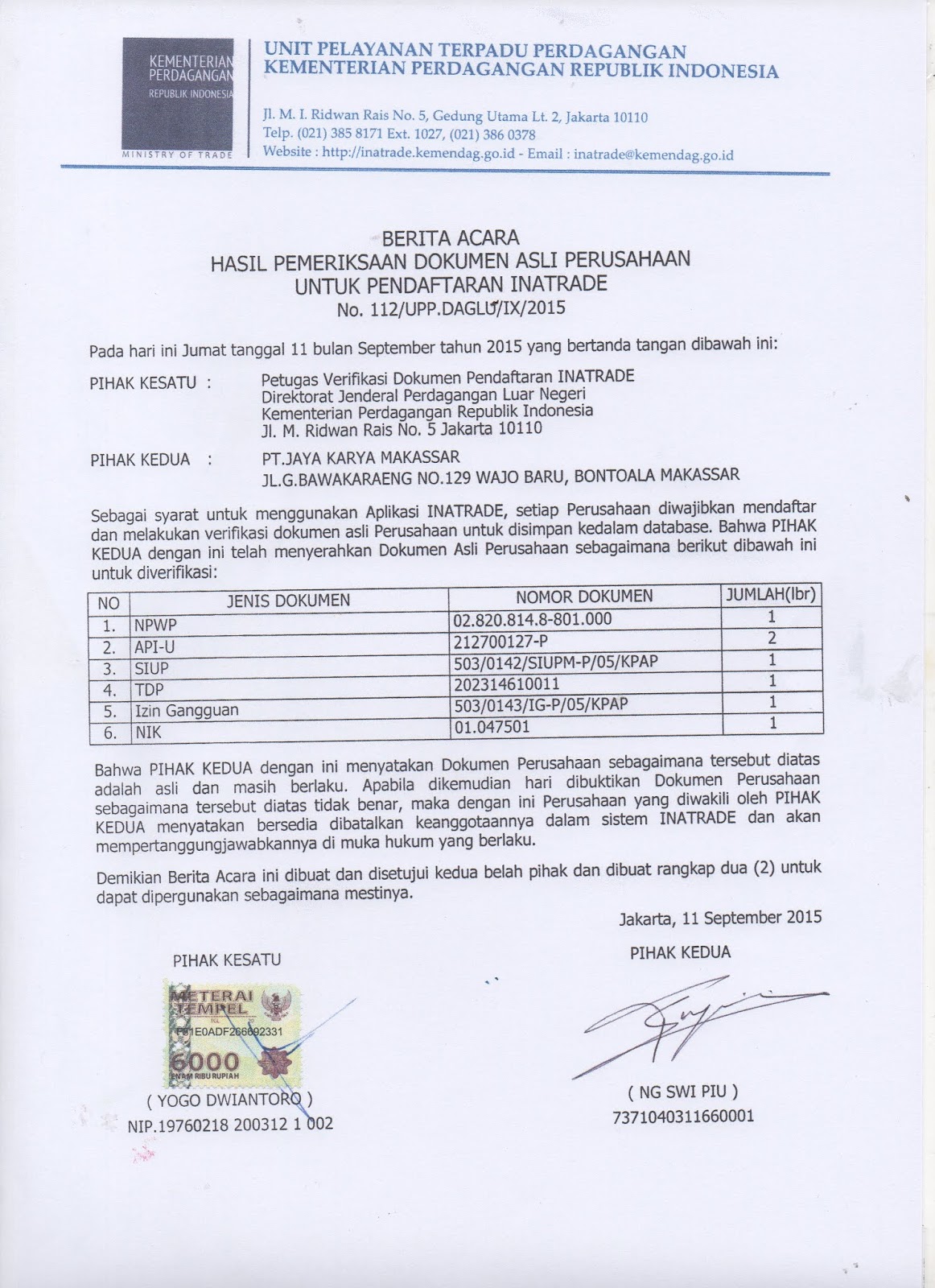 Hasil Pemeriksaan Dokumen Asli Perusahaan PT Jaya Karya Makassar PT